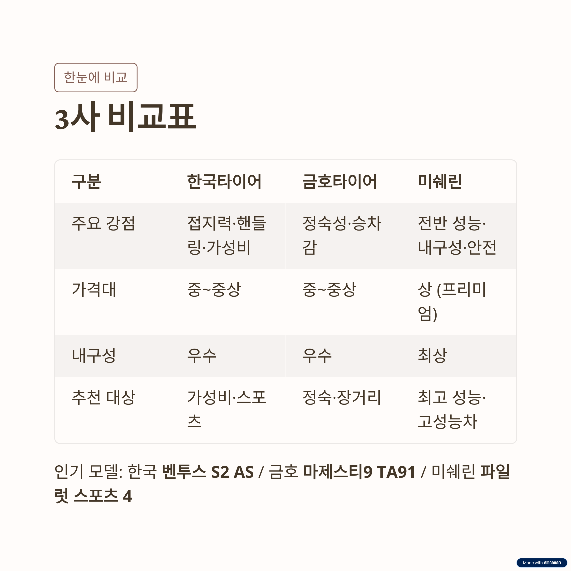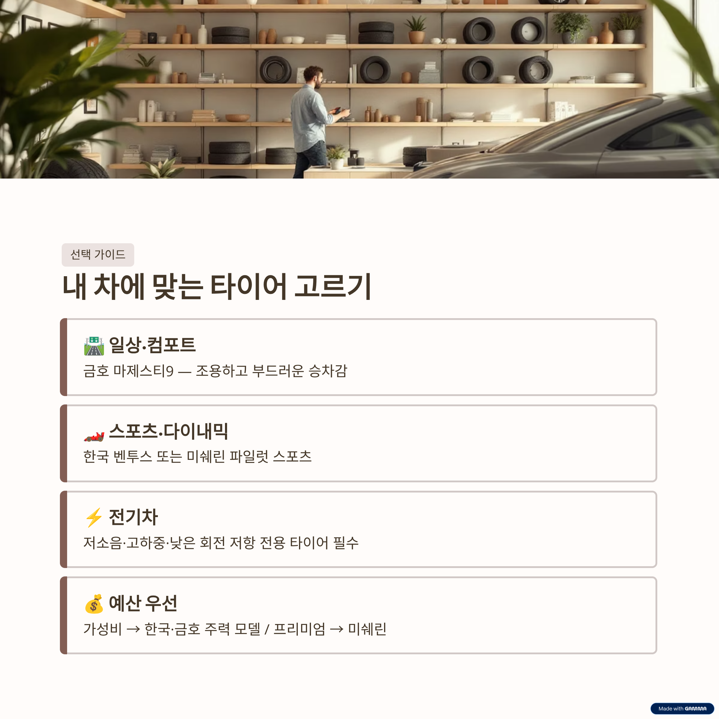 - ✅ 한국(가성비/접지력), 금호(정숙성/승차감), 미쉐린(최고성능/내구성) 중 내 스타일에 맞춰 선택하세요.